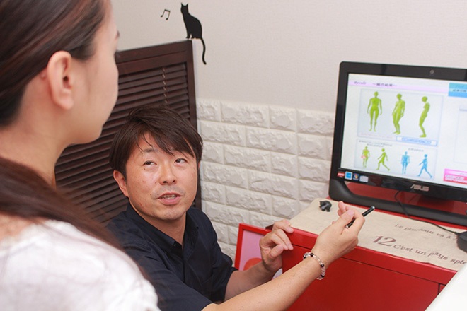 健康な身体作りを目指せる【全身整体60分+姿勢・動作分析30分】は、新規のお客さまにおすすめのメニュー。最初にカウンセリングで既往歴やお悩みをうかがってから、専用マシンで身体をチェックしていきます。色分け表示された身体の3D画像を見てお客さまに現在の身体の状態を把握していただいてから、施術を行っていきます。
