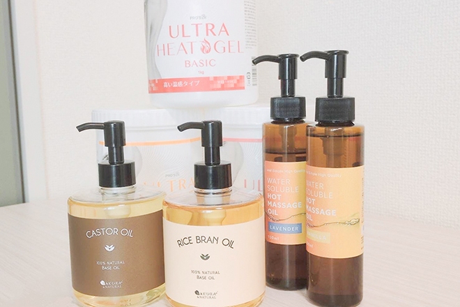 当サロンでは、「温感ジェル」を使った珍しい施術を提供しています。オイルより硬いテクスチャーで肌に貼りつくので、筋肉やリンパをしっかり捉えて流せることからよりスッキリ感を感じていただけるのが特徴。また,オイルより乾きづらいので、乾燥肌の方にはジェルの方がおすすめ◎