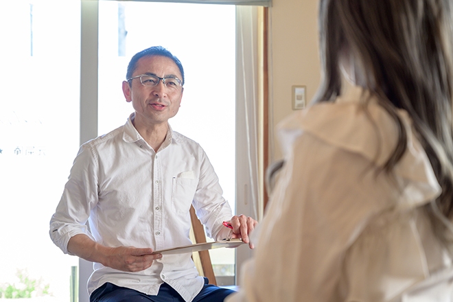 当店では、不調原因の追究にも力を入れています。ご来店いただいたらまずヒアリングシートをご記入いただき、それをもとにお悩みや日頃の生活習慣などをヒアリング。口頭でのヒアリングの後は、実際にお客さまの身体を拝見してさらに細かくチェックをしていきます。