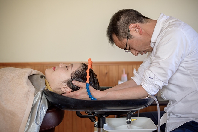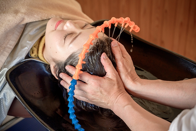 カウンセリング&施術説明後に椅子に座った状態で頭皮の緊張を緩めるローションを塗布。その後ベッドに移動していただき、循環器を使ってヘッドスパ専用水の水流を頭に当てながら、頭蓋骨調整も交えつつ頭全体をほぐしてきます。