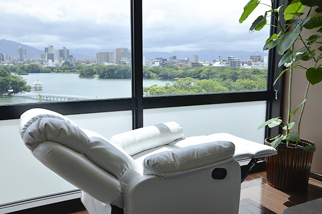 ホテルの一室のようなお部屋に笑顔でお迎えいただいたら、その日は気持ちのよい晴れの日で窓から大濠公園のスワンボートが浮かぶ絶景が広がっていました。