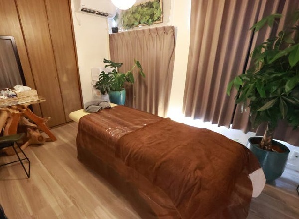 アースカラーを基調とした店内は、柔らかく灯る間接照明や観葉植物が配された心地よい空間。強めの圧で脂肪をほぐすインド式トリートメントをはじめ、体を芯から温めるハーブ浴、緊張からくる頭皮のこわばりをゆるめるヘッドケアなど、癒しと痩身をかなえる多彩なメニューを用意。芳しいアロマの香りに包まれながら、引き締まった美ボディをめざして。