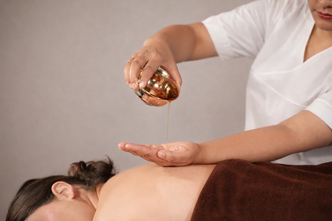 アーユルヴェーダを軸にしたトリートメント。ハーブ配合オイルでマルマポイントを刺激しながらリンパを流す至福体験♪